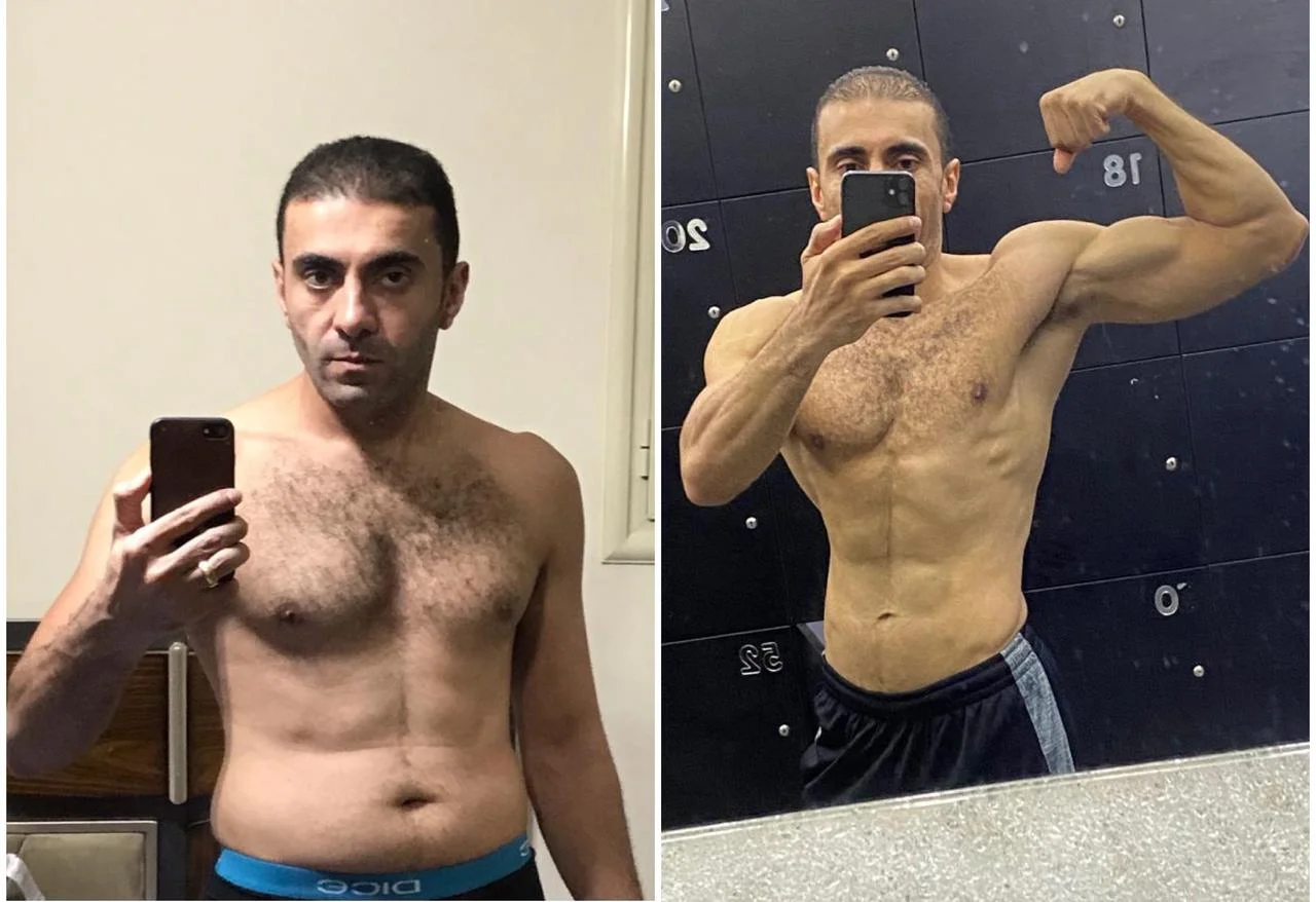 "استاذ مجدي 43 سنة حلمة كان الوصول لفورمة الممثلين والمشاهير بس كان في ( اعراض مقاومة انسولين + دهون حشوية ) كانت عائق كبير بالنسبالة والحمدلله بعد اشتراكة معايا في باقة +30 قدرنا نحقق"