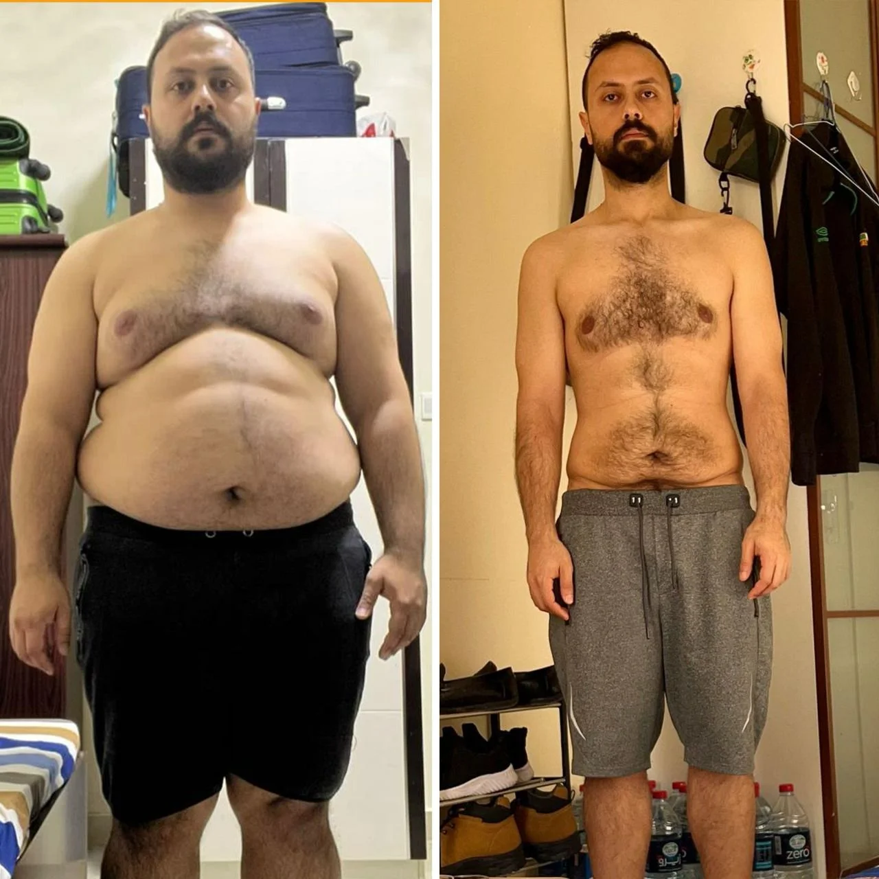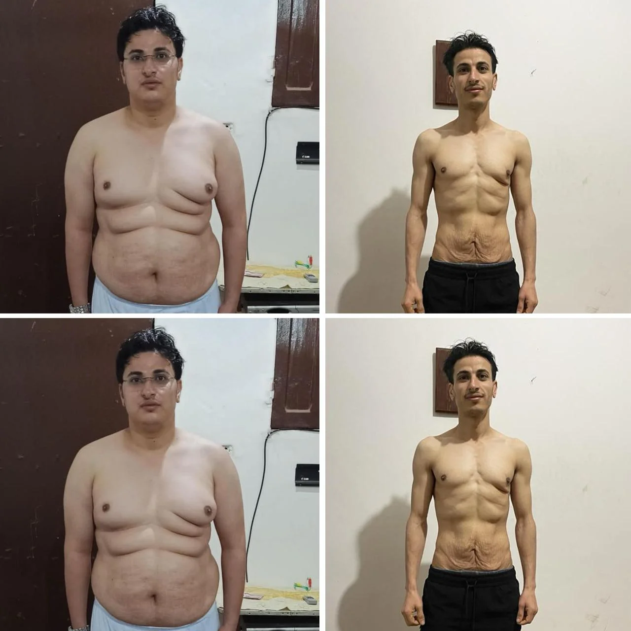 أحمد حالته مختلفة تماما لأنه كان وزنه 128 كيلو وكان المفترض أنه يشترك في باقة ( بديل التكميم ) لكنه أصر وصمم أنه هو عايز يشترك في باقة ( الSpeed ) وأنه هو يكثف النتيجة وطبعا كان مستحيل أنه احنا نوصل لهدف اللي هو عايزه في ثلاث شهور !! فكانت حالته استثنائية جدا وقرر أنه هو يشترك معايا لمدة (5 شهور Speed ) مكثفين عشان نقدر في الخمس شهور نعمل نتيجة قوية وسريعة ونختصر اللي ممكن نعمله في 12 شهر في 5 شهور فقط وأنا كان عندي تخوف جدا أنه ممكن لقدر الله يحصل ترهلات ❌ وأنا ما بحبش أعمل لأي عميل عندي أي عرض جانبي سواء ترهلات أو مضاعفات صحية بس الحمد لله بتوفيق من ربنا وبعامل الخبرة اللي عندي قدرت أني اتعامل مع حالته ووصله لهدفه في خمس شهور فقط واختصر عليه الطريق وفي 5 شهور النتيجة: