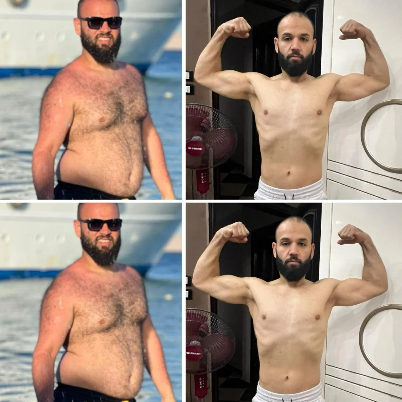"Mr. Kareem, 37 years old, never considered exercising or following a healthy lifestyle. However, due to his declining health and being diagnosed with some illnesses, along with doctors' advice to change his lifestyle, he decided to join me. Here were the results:"